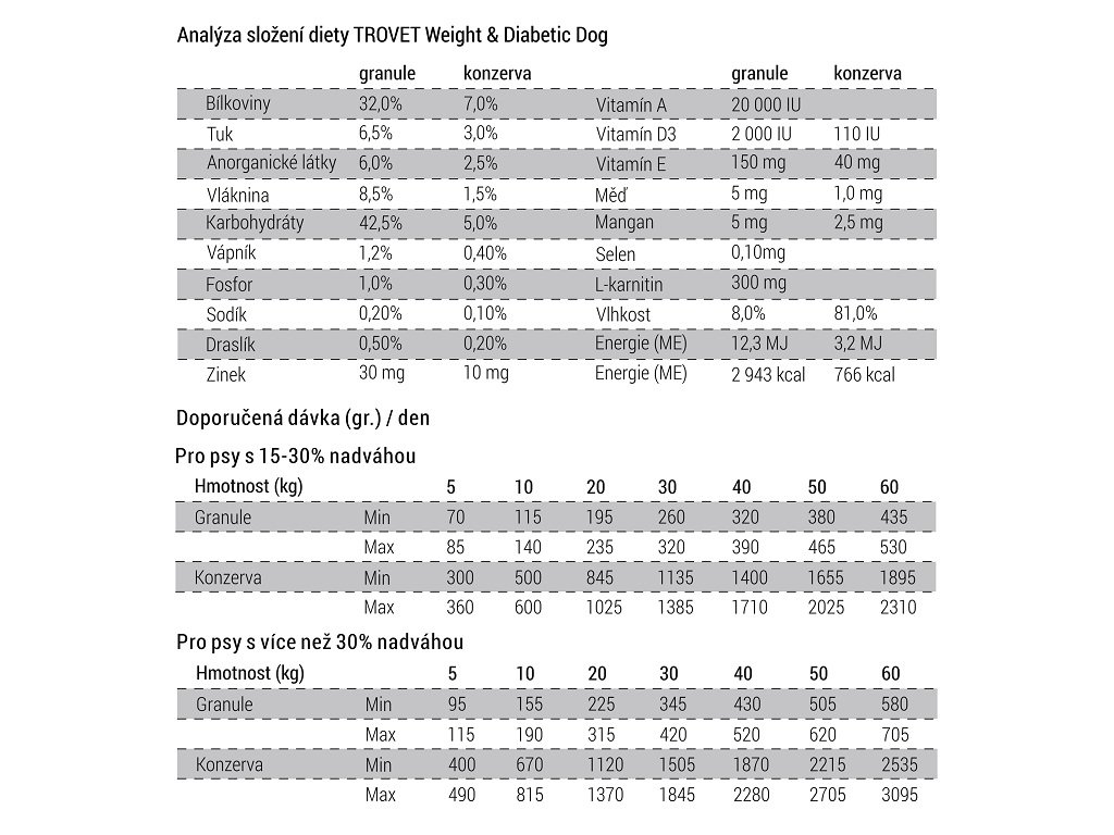 - Dietu TROVET Weight & Diabetic podáváme až do chvíle, kdy pes dosáhne požadované váhy.